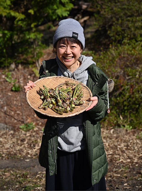 📸 Photo is of Mika holding a basket of Taranome, a wild vegetable, taken in spring 2023.