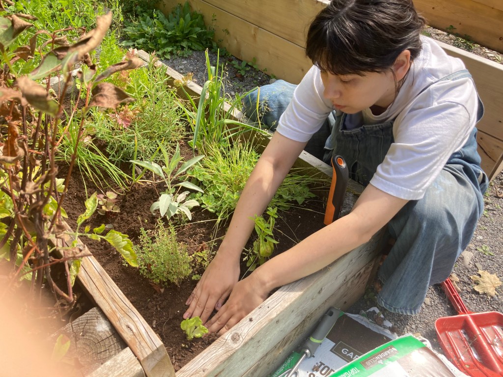 Me planting a scrap lettuce core in my first raised bed garden. The family of the home whose basement apartment my partner and I were staying in built it. They invited me to plant in it. I had told them upon moving in that I had been wanting for several summers to start growing food! Summer 2024, in Gaspé.🌱